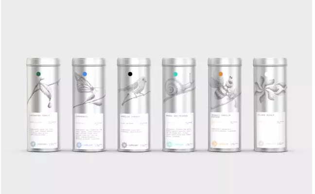 culteavo將自家的茶葉用錫罐作為包裝,每一個(gè)罐子上的都有小鳥(niǎo)、樹(shù)葉、蝸牛、蝴蝶等自然圖案。采用素描的手法,根據(jù)圓點(diǎn)之間疏密關(guān)系排列出來(lái)。而罐子下面的白色標(biāo)簽則寫清了使用方式,都使茶葉包裝盒顯得十分素雅,就沖著這那么有藝術(shù)感的茶葉包裝,我一定要收藏幾罐茶葉,誰(shuí)都不要攔我!